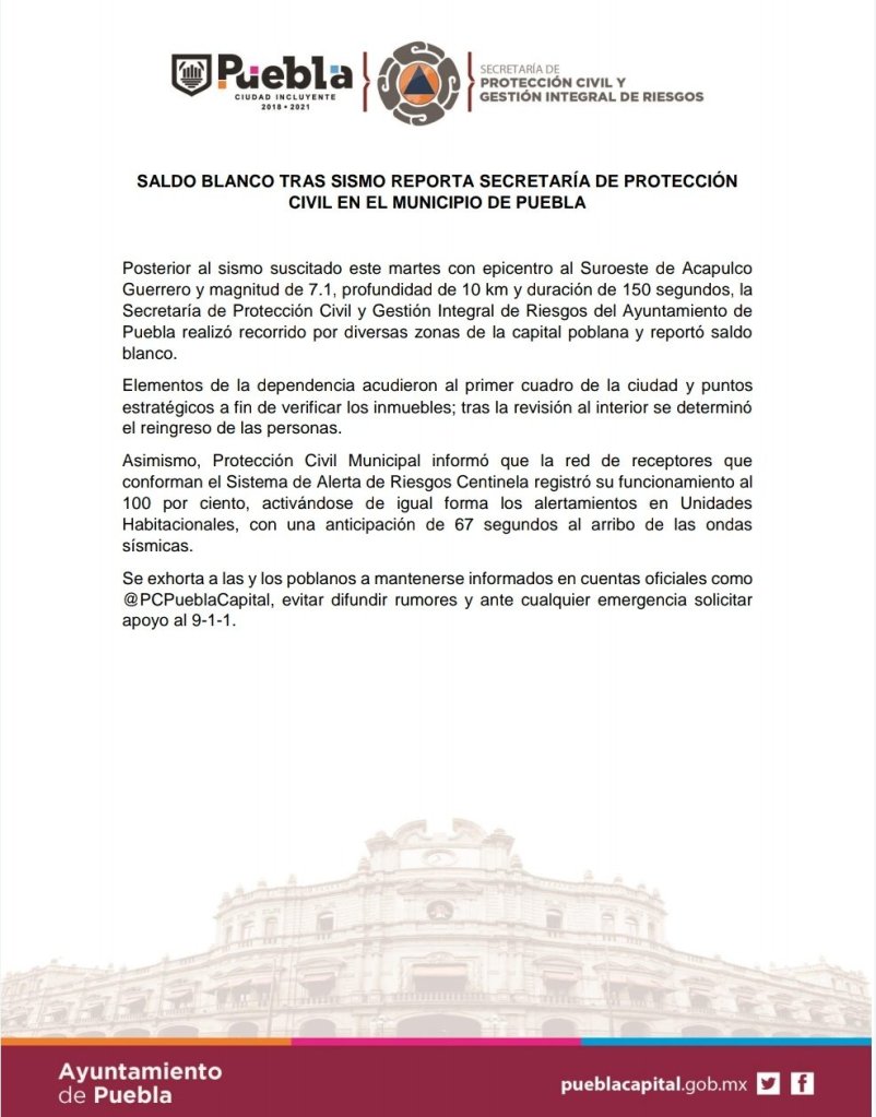 El gobierno de Puebla, a través de la Coordinación General de Protección Civil del Estado (Cgpce), confirmó el saldo blanco tras el sismo de magnitud 7.1 que se registró a las 20:47 horas a 14 kilómetros al suroeste de Acapulco, Guerrero, con profundidad de 10 kilómetros y una duración de 150 segundos.
