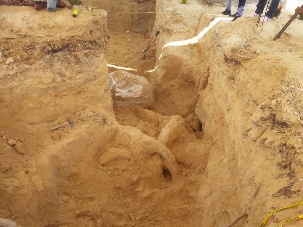 Informó que a la semana se empezaron los trabajos de remoción de tierra en la zona del hallazgo, donde se hizo una excavación controlada con un cuadrante de 6×6 metros, en donde se halló parte del cráneo, el cual se encuentra fragmentado, y en la parte sureste de la excavación se encontró una defensa o colmillos con una longitud de 2 metros con 90 centímetros.