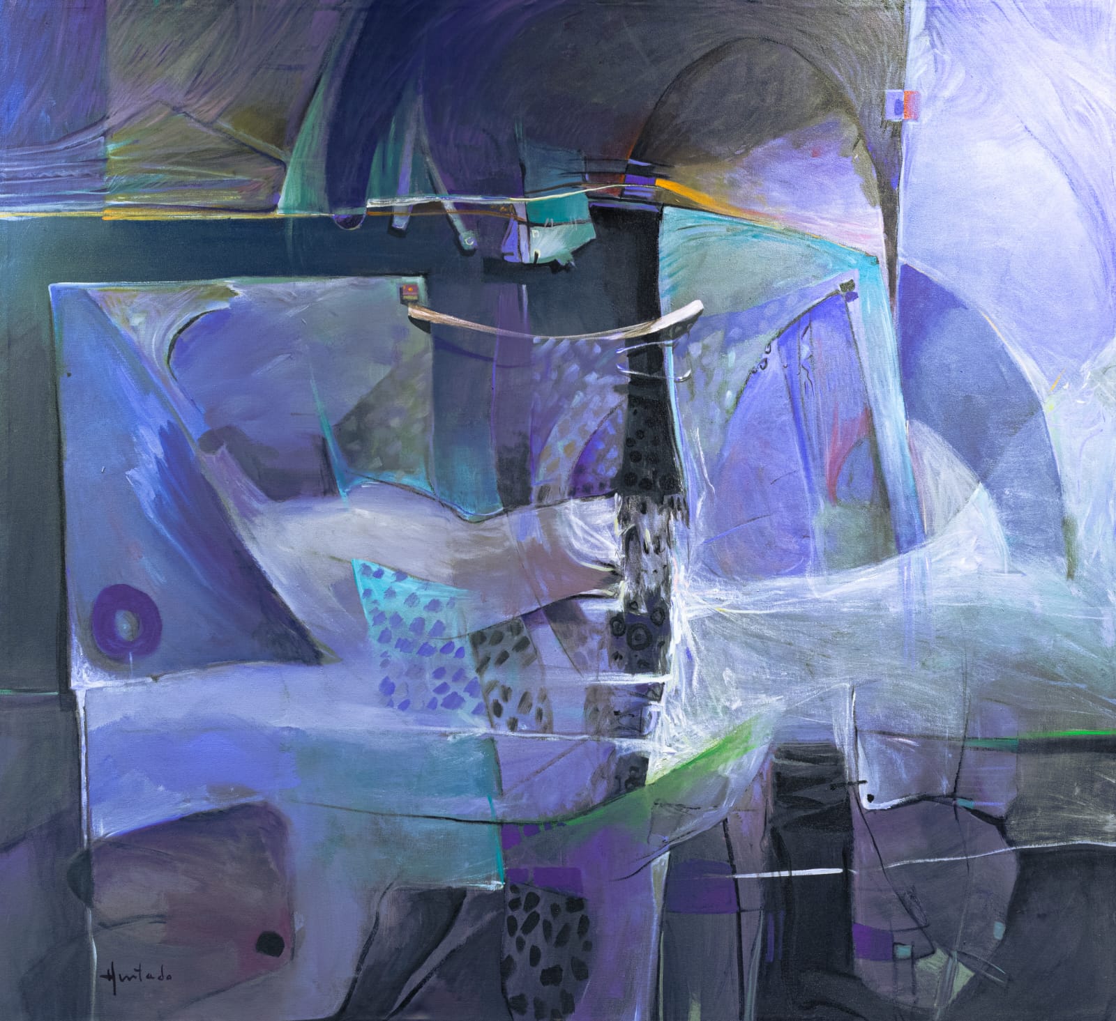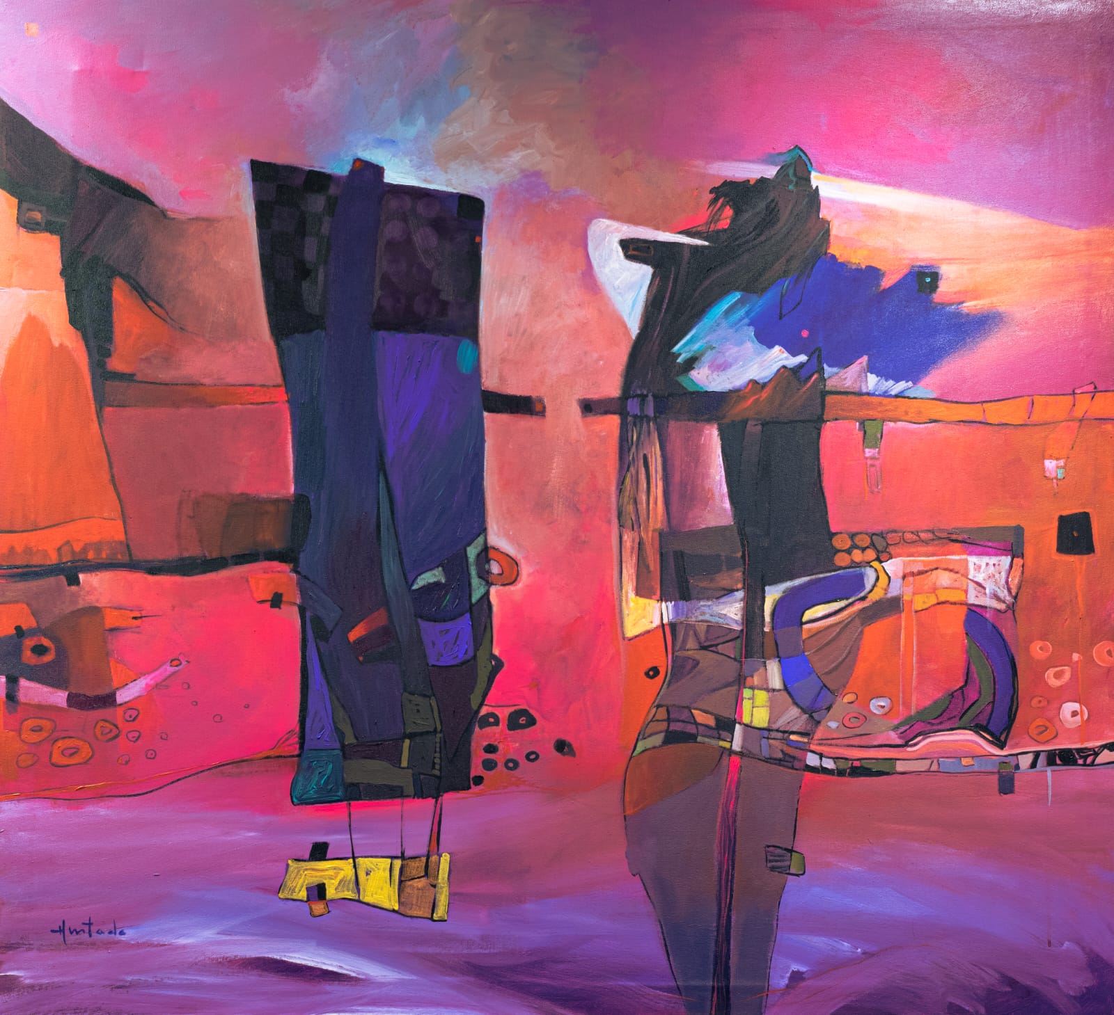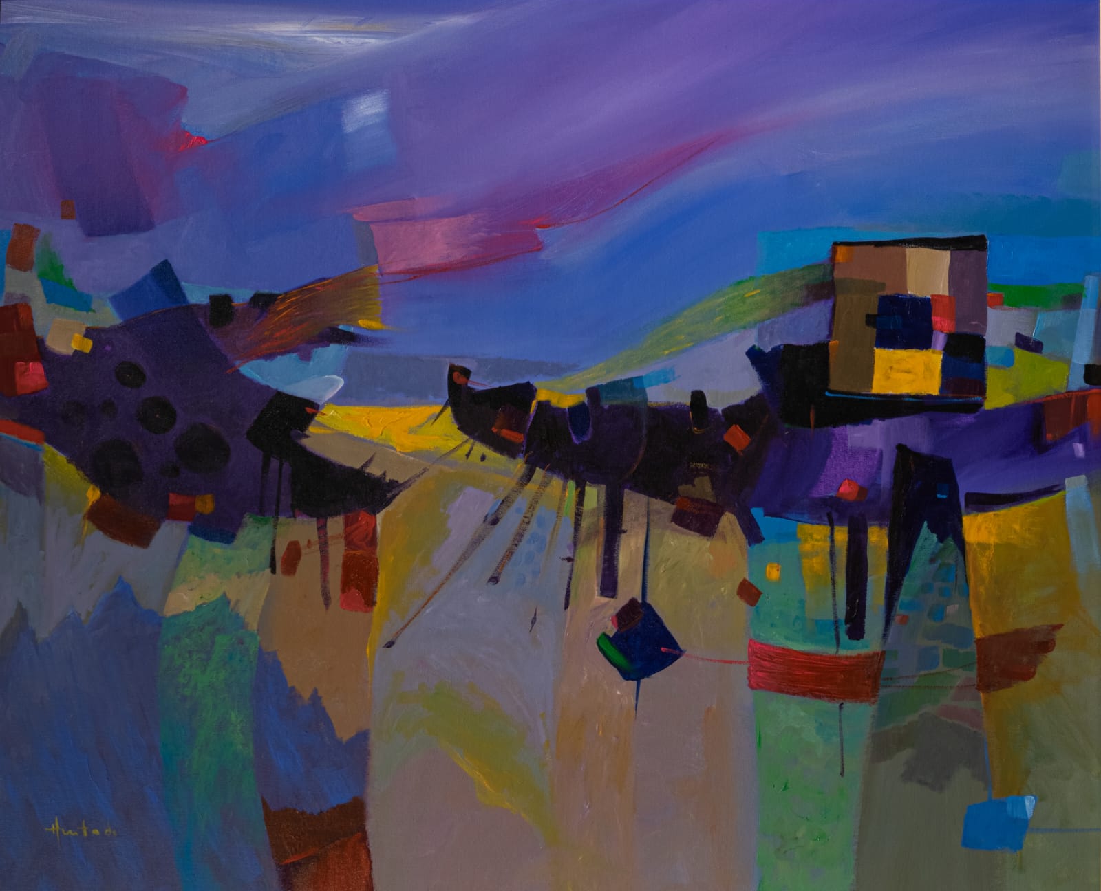 El diálogo con las corrientes, los movimientos, los ismos y los estilos es interesante y enriquecedor. Sin embargo, yo me encuentro con un lenguaje y acento andino desde la pictografía aplicada en la cerámica, las incisiones en los petroglifos, como también en la textilería ancestral que con la perspectiva aérea enriquecen mi visión representativa, esto aplicado en diversos soportes sostiene mi lenguaje simbólico espacial. El grito de mi silencio abarca musicalización colorida donde la yuxtaposición de las formas se vuelve telar de matices pictórico entre mitos y leyendas del futuro.