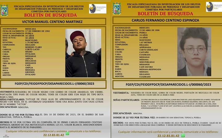 En tanto, la ficha de búsqueda que la Fiscalía General del Estado (FGE) emitió para el caso de Víctor Manuel Centeno Martínez, indica que también fue visto por última ocasión el 10 de enero cuando estaba en compañía de su primo Carlos Fernando a bordo de una motocicleta Honda 125 CC de color blanco.